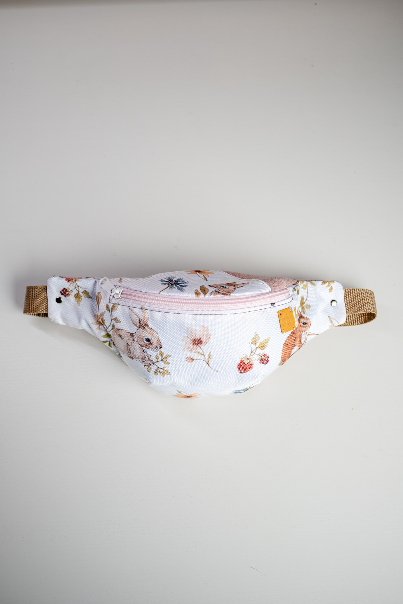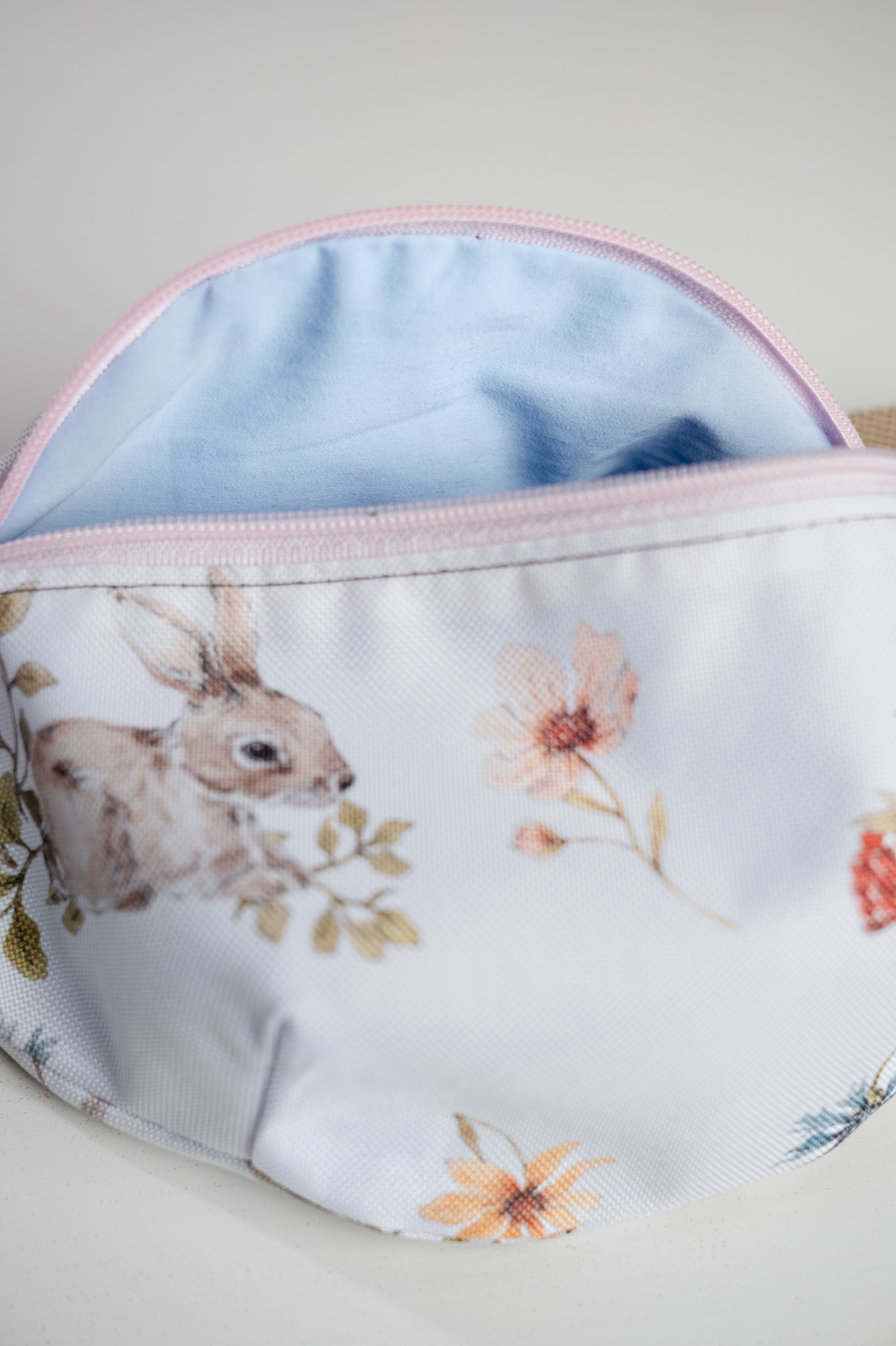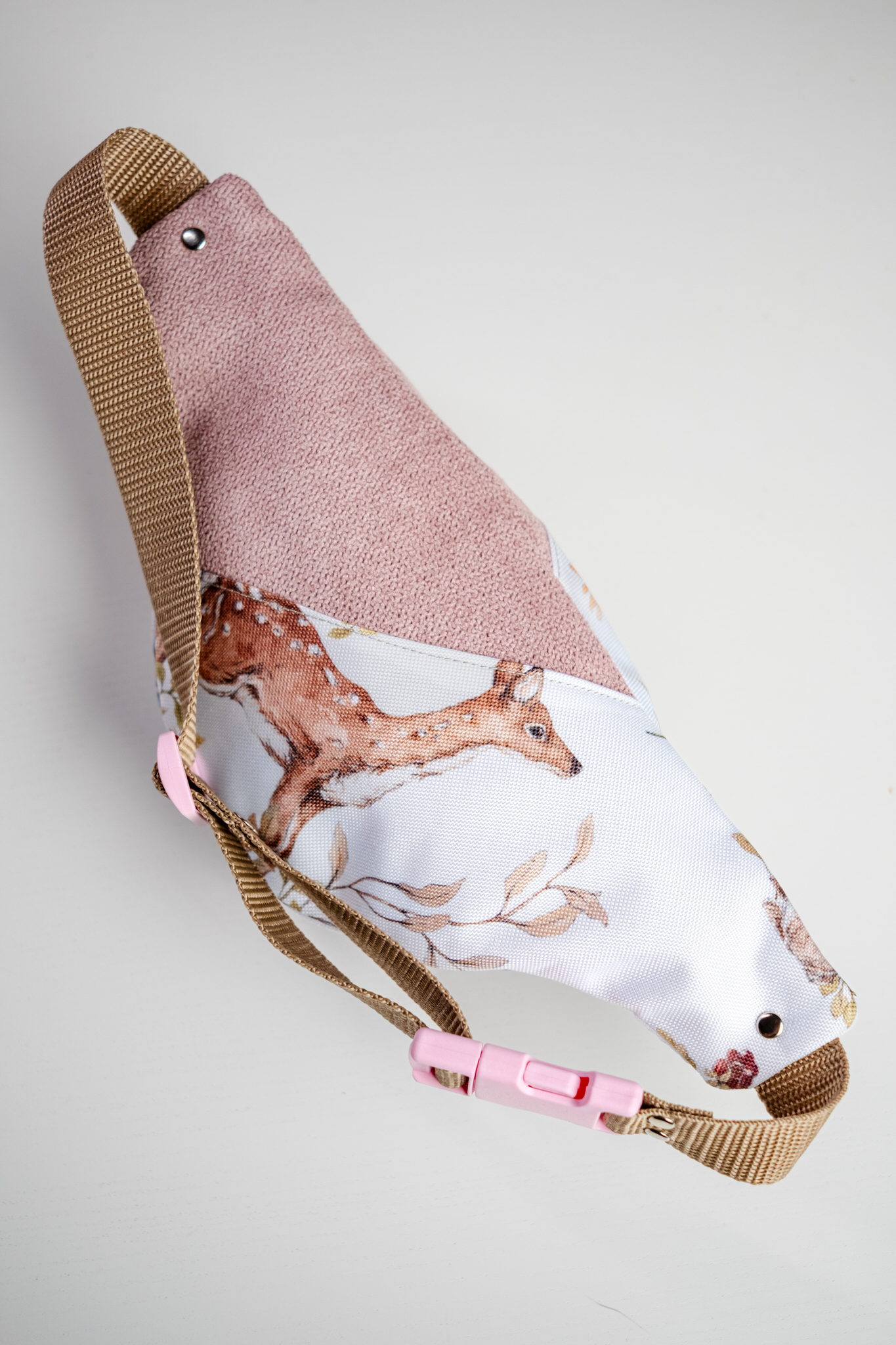 Materiały zewnętrzny to poliester wodoodporny w kolorze białem z wizerunkiem leśnych roślin i zwierząt oraz tkanina obiciowa w kolorze zgaszonego różu. W środku bawełniana błękitna podszewka. Poliestrowy parciany pasek jest prosty w konserwacji, trwały i wytrzymały. Saszetka zapinana jest za pomocą plastikowej klamry. Pasek posiada regulację.