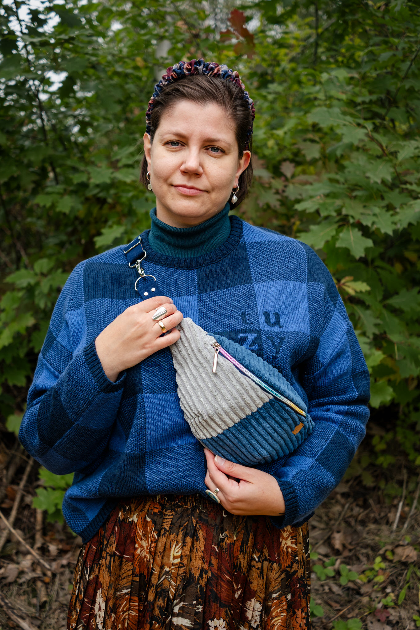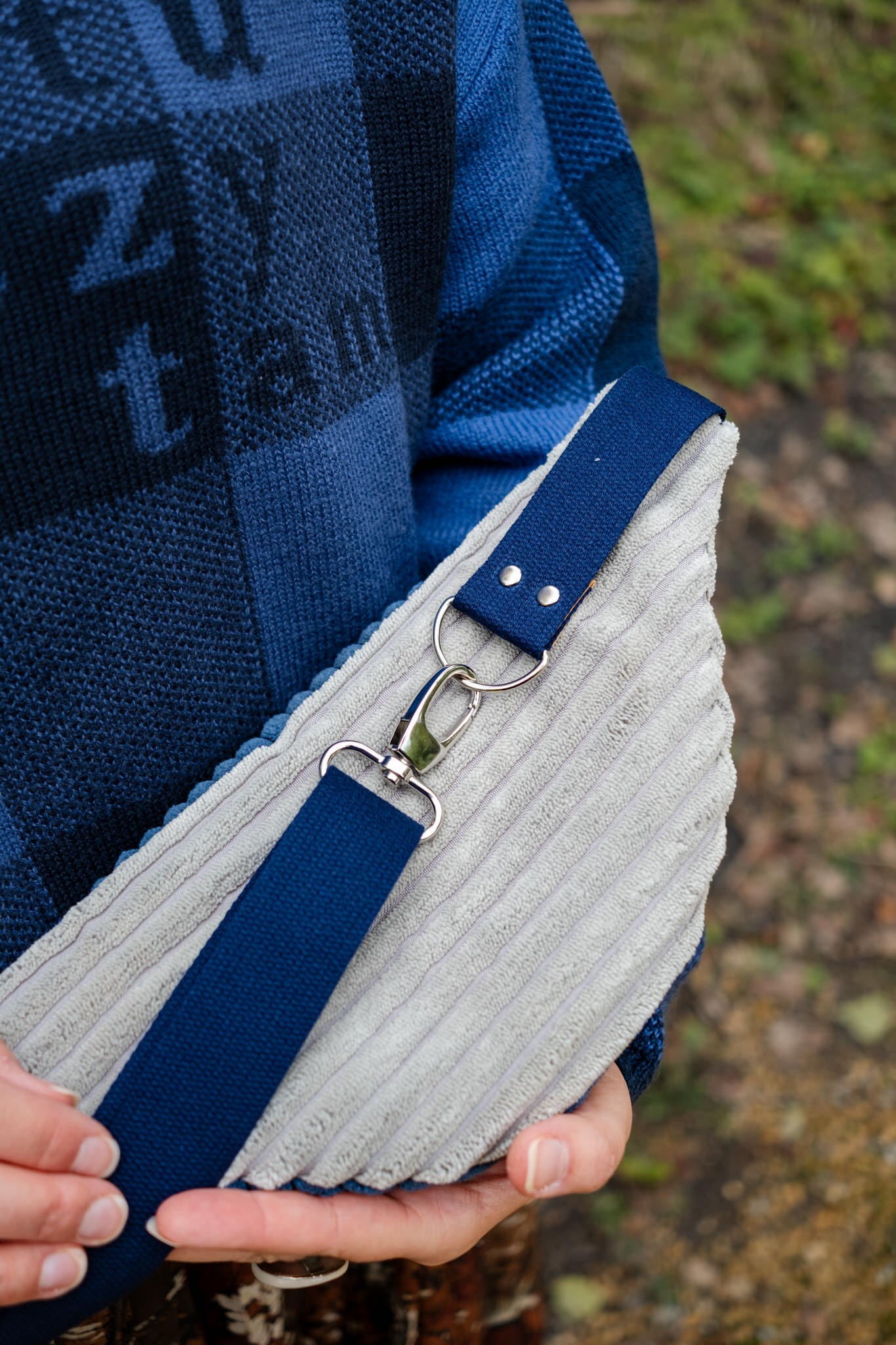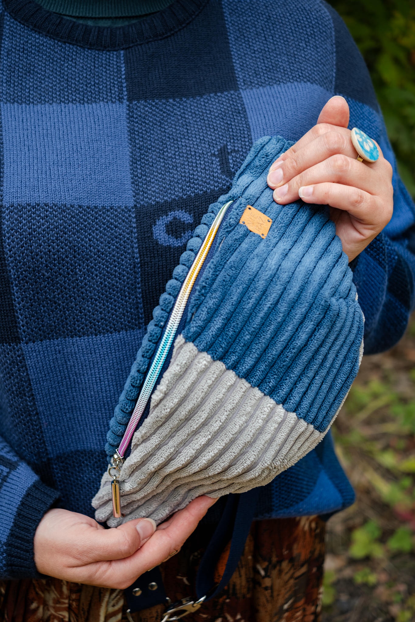Nerka sztruksowa w kolorze szarym i niebieskim. Tkanina zewnętrza to kawałki sztruksu tapicerskiego – odpady z firmy meblowej. Materiał jest nowy, pełnowartościowy, jednak pozostałe po tapicerowaniu mebli fragmenty, są tak małe, że zostają uznane za odpad. Wnętrze odszyłam z uroczej, wzorzystej bawełny z drugiego obiegu. W podszewce wsuwana kieszonka.