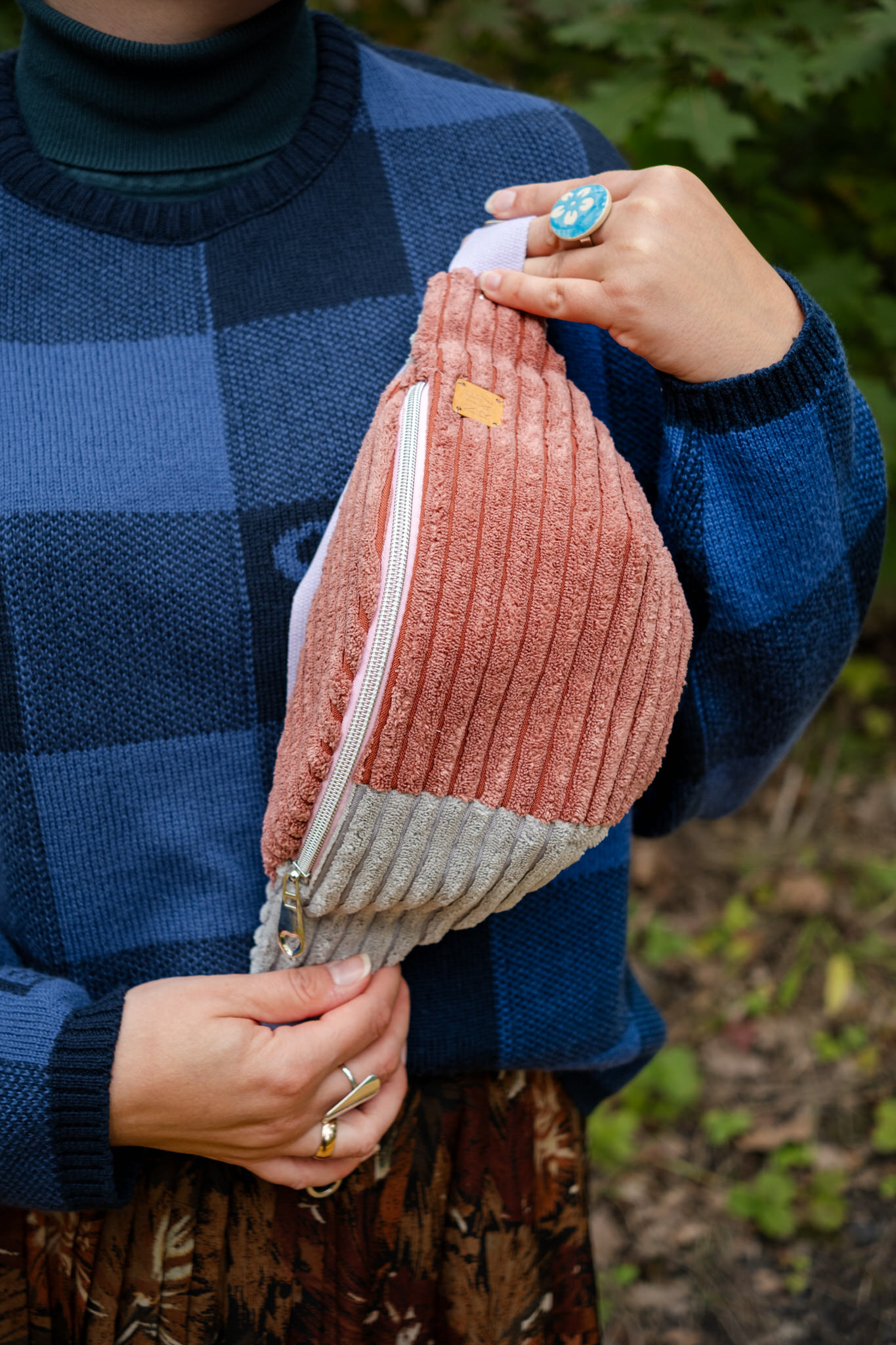 Nerka sztruksowa w kolorze szarym i różowym.  Tkanina zewnętrza to kawałki sztruksu tapicerskiego – odpady z firmy meblowej. Materiał jest nowy, pełnowartościowy, jednak pozostałe po tapicerowaniu mebli fragmenty, są tak małe, że zostają uznane za odpad. Wnętrze odszyłam z uroczej, wzorzystej bawełny z drugiego obiegu i fragmentu koszuli. W podszewce wsuwana kieszonka.