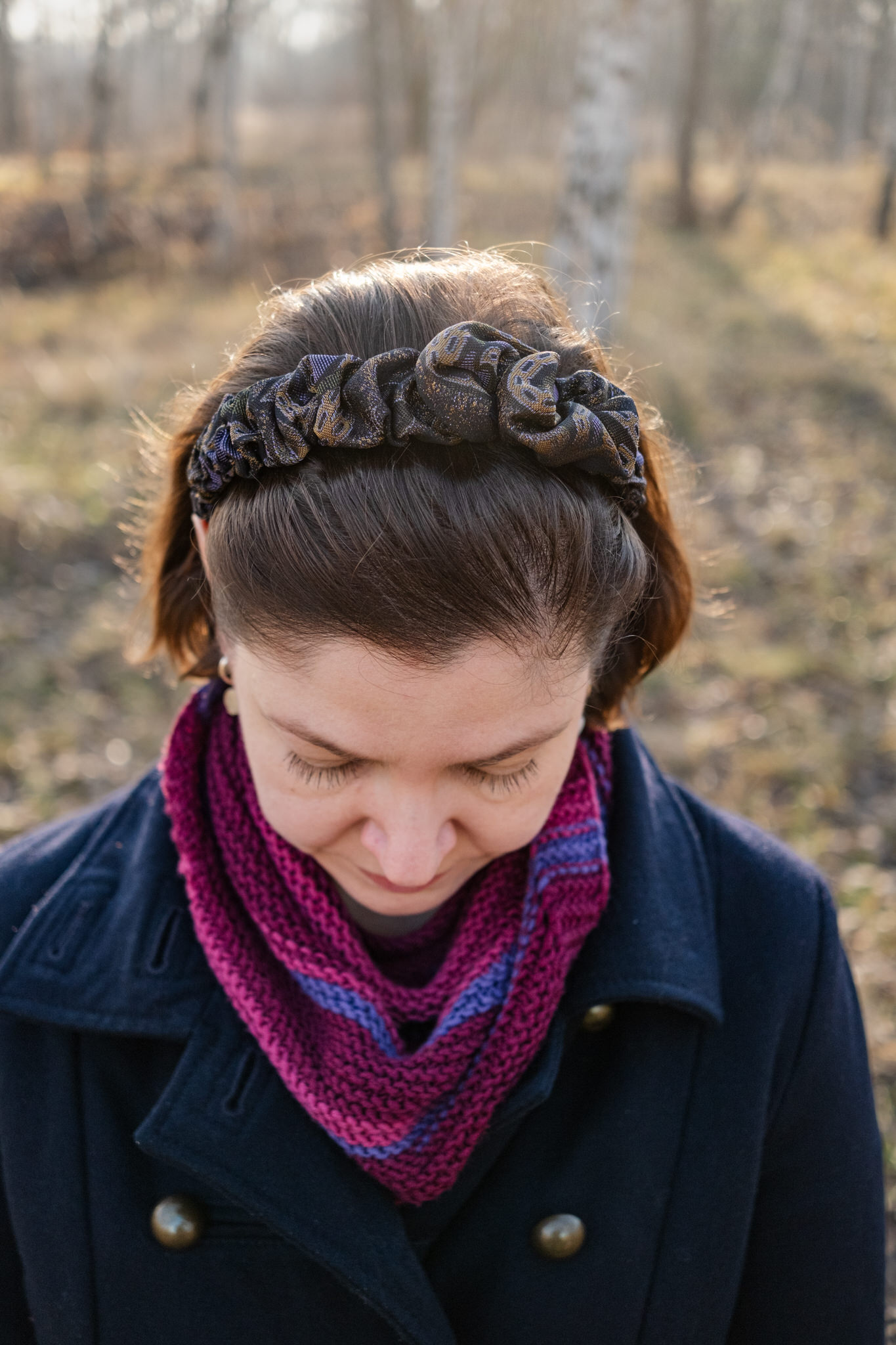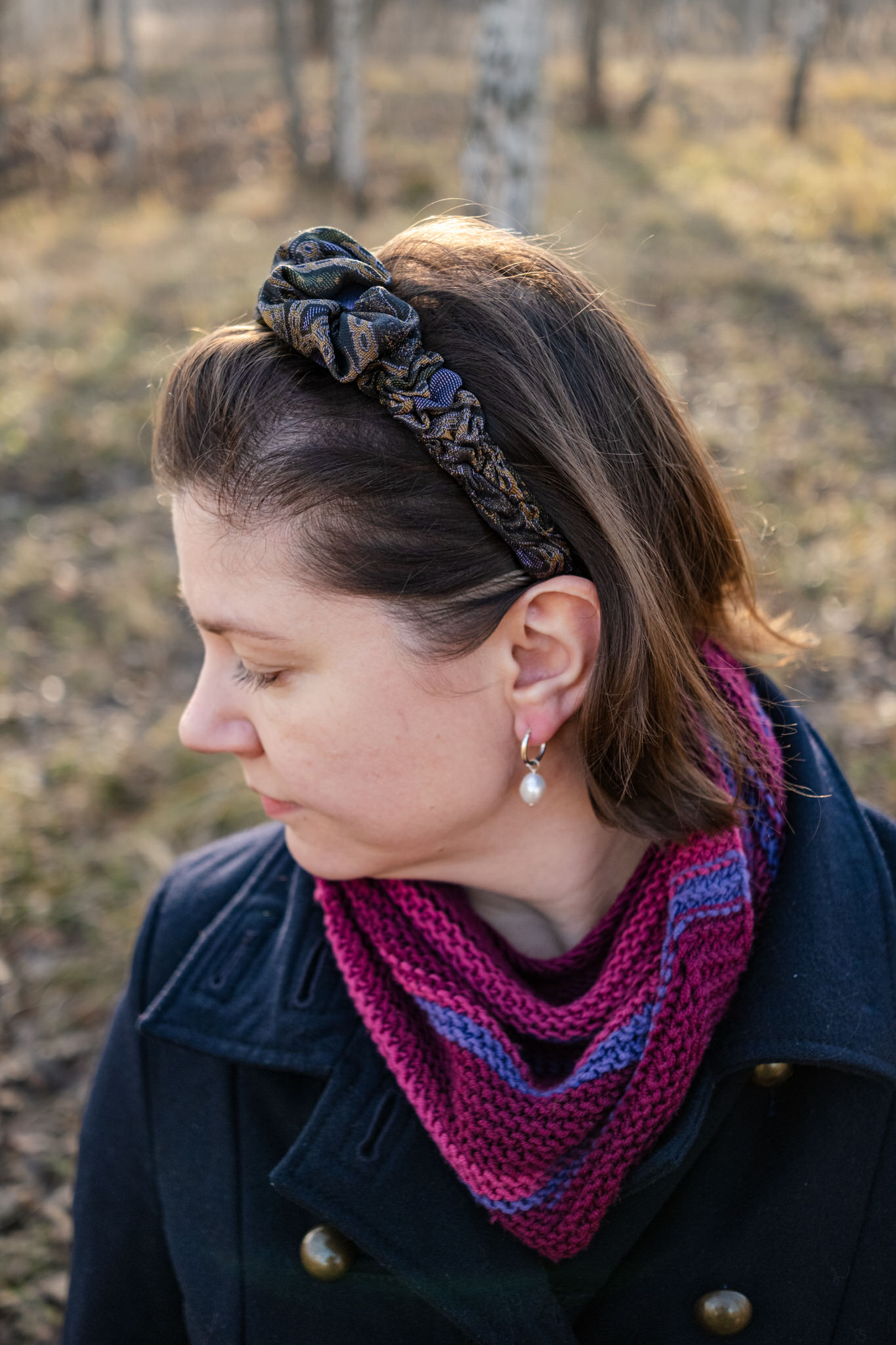 Opaska w rozproszonym świetle dziennym wygląda ciemniej niż na zdjęciach studyjnych, błyszczące złote nitki pięknie odbijają światło.