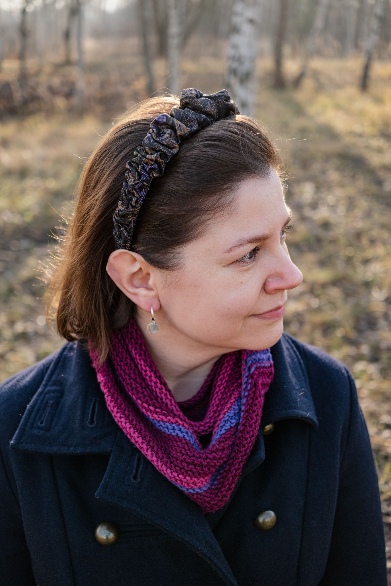 Jedwabna opaska do włosów z autorskim asymetrycznym upięciem zwieńczonym fioletowym guziczkiem. Kolor opaski to czerń, fiolet, ciemne złoto i brąz. Tkanina mięsista, żakardowa, tkana grubymi matowymi i błyszczącymi nitkami przypomina gobelin. Całość wygląda niezwykle elegancko i luksusowo.