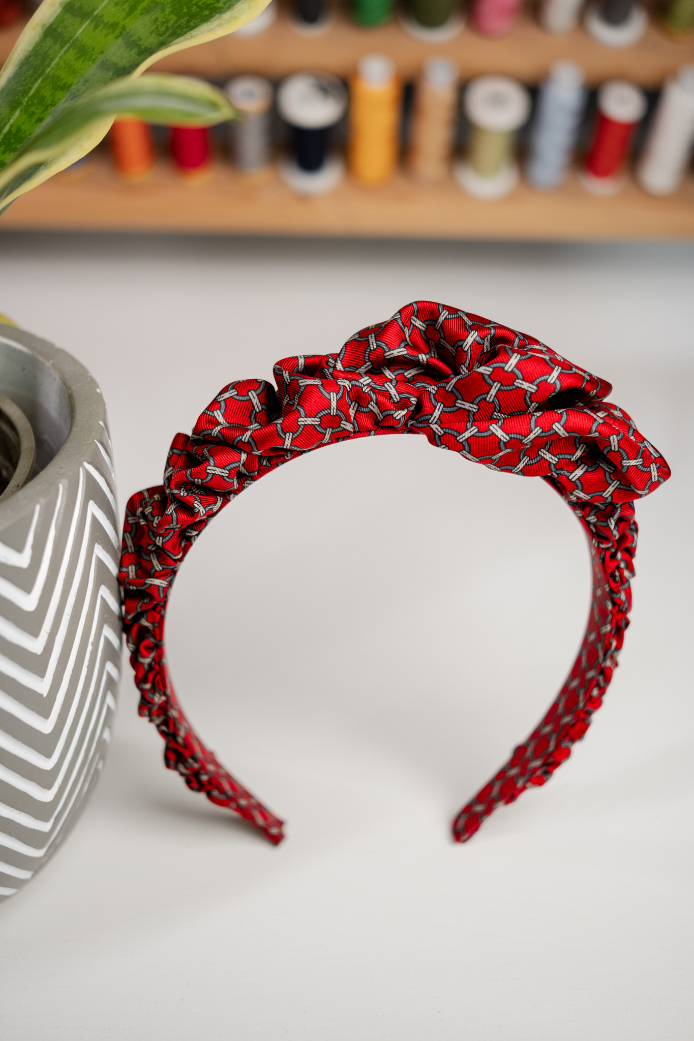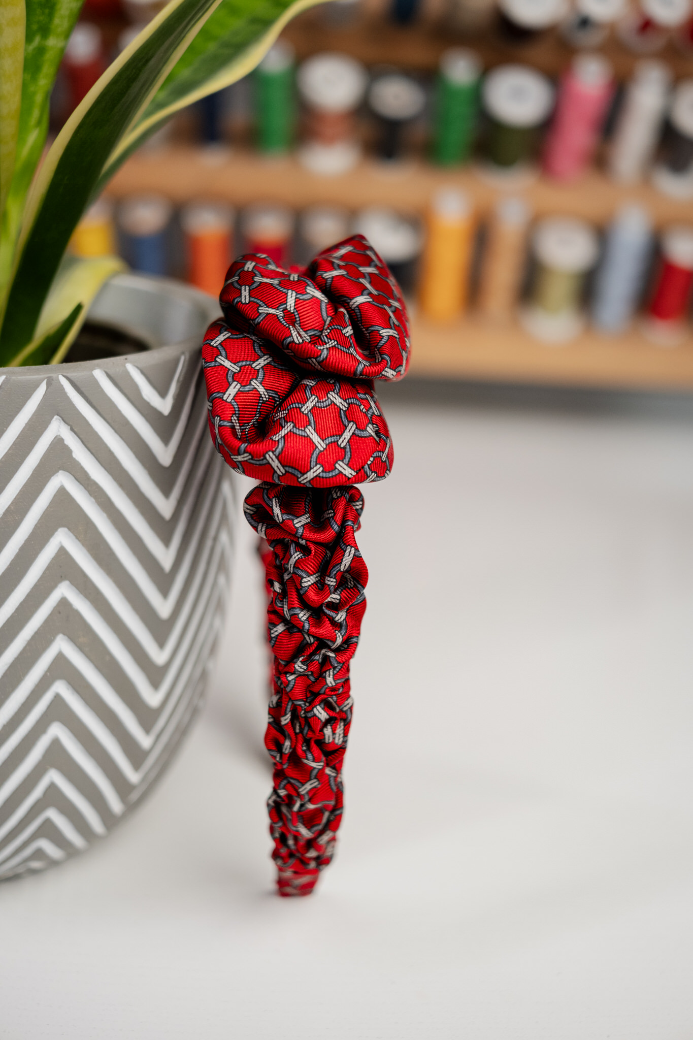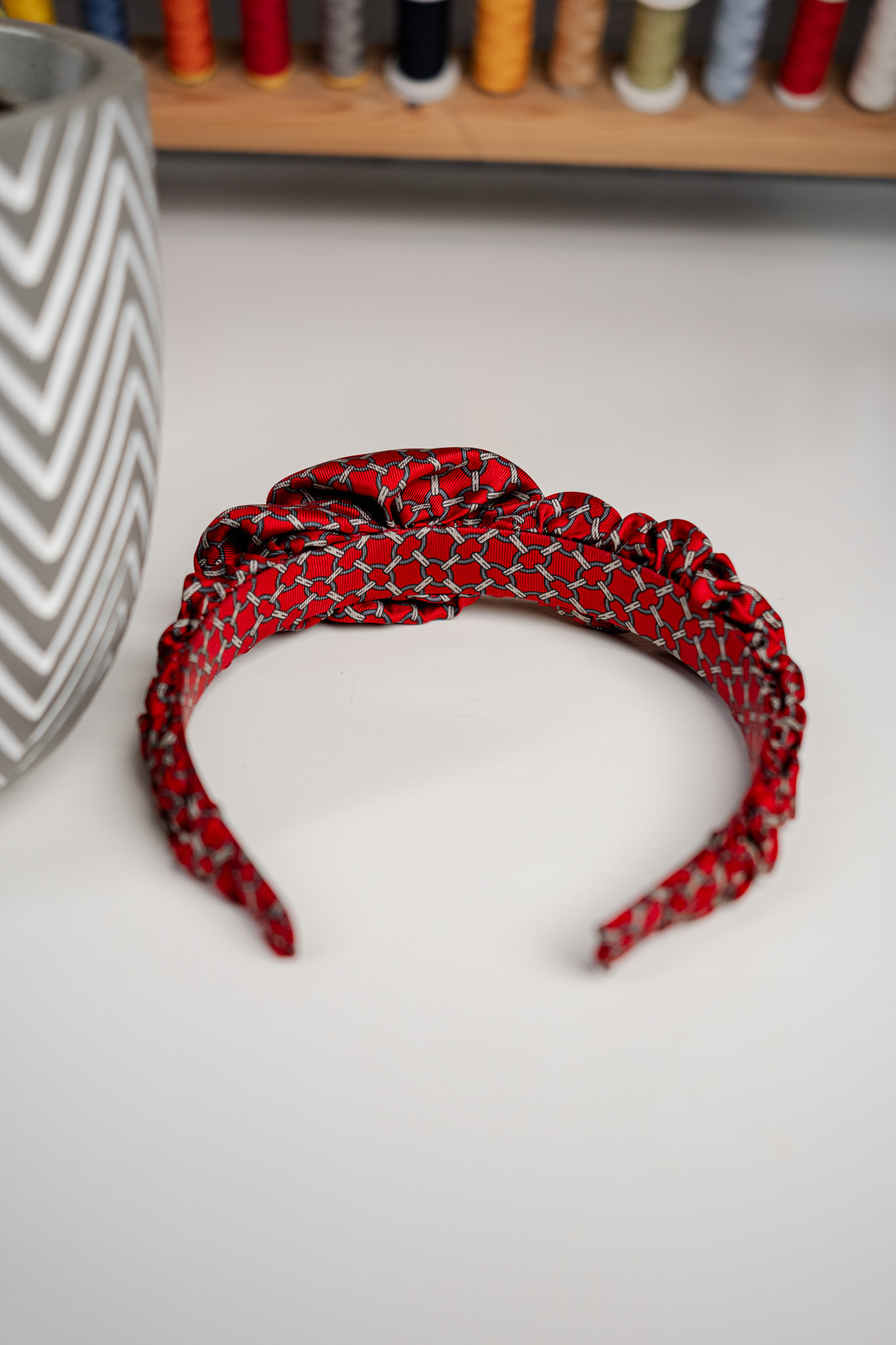 Jedwabna opaska do włosów z autorskim asymetrycznym upięciem. Kolor opaski to zgaszona czerwień. Tkanina delikatnie połyskująca. Wzór to kółka i paski w kolorze szarym układające się we wzór siatki/łańcucha.