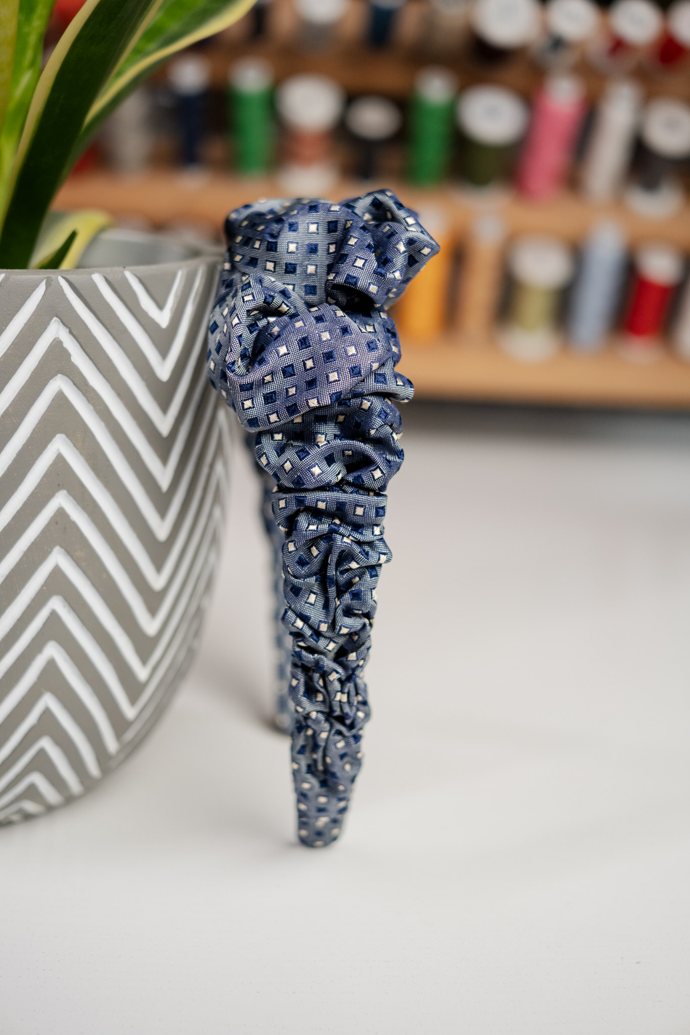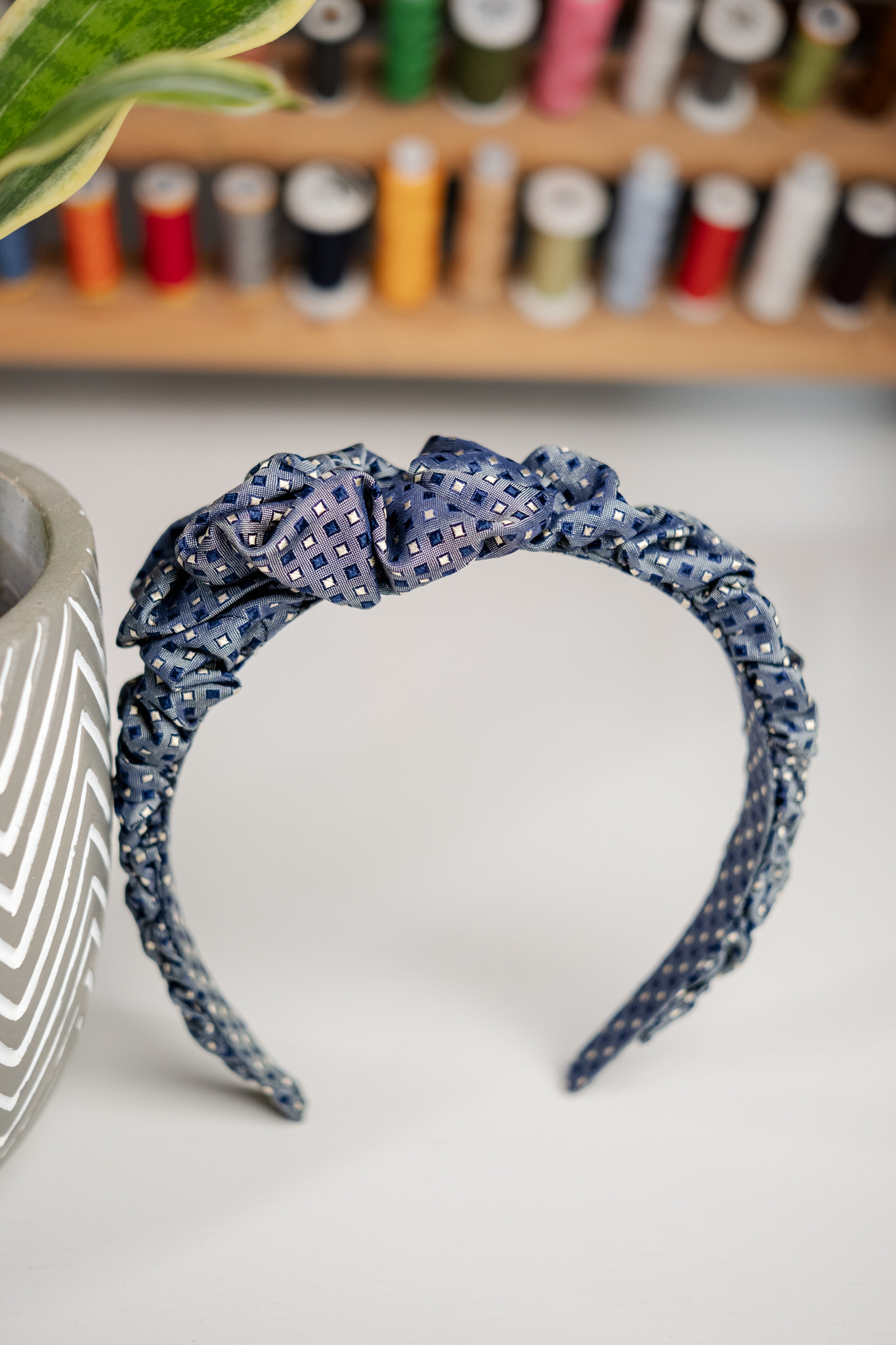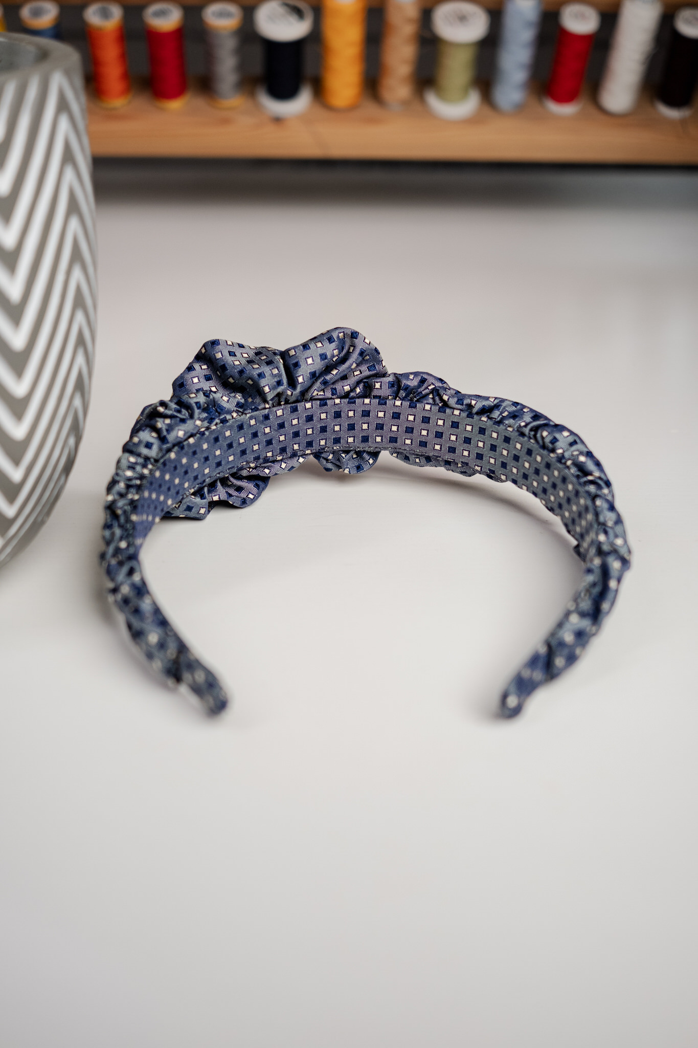 Jedwabna opaska do włosów z delikatnym asymetrycznym marszczeniem. Wzór to granatowe i białe kwadraciki na niebieskim tle.