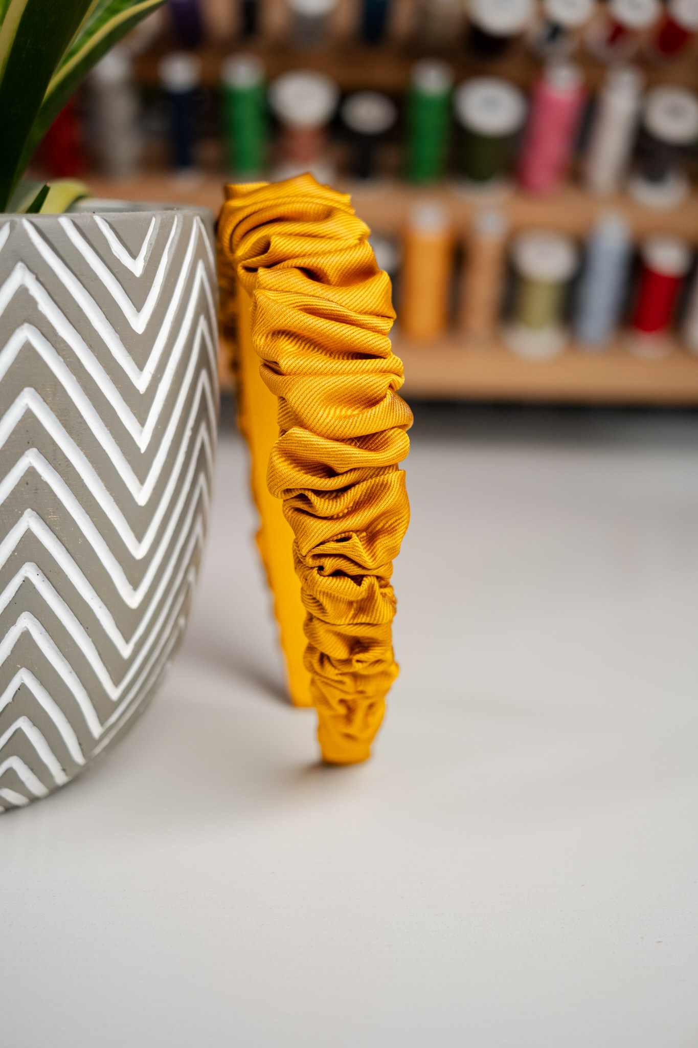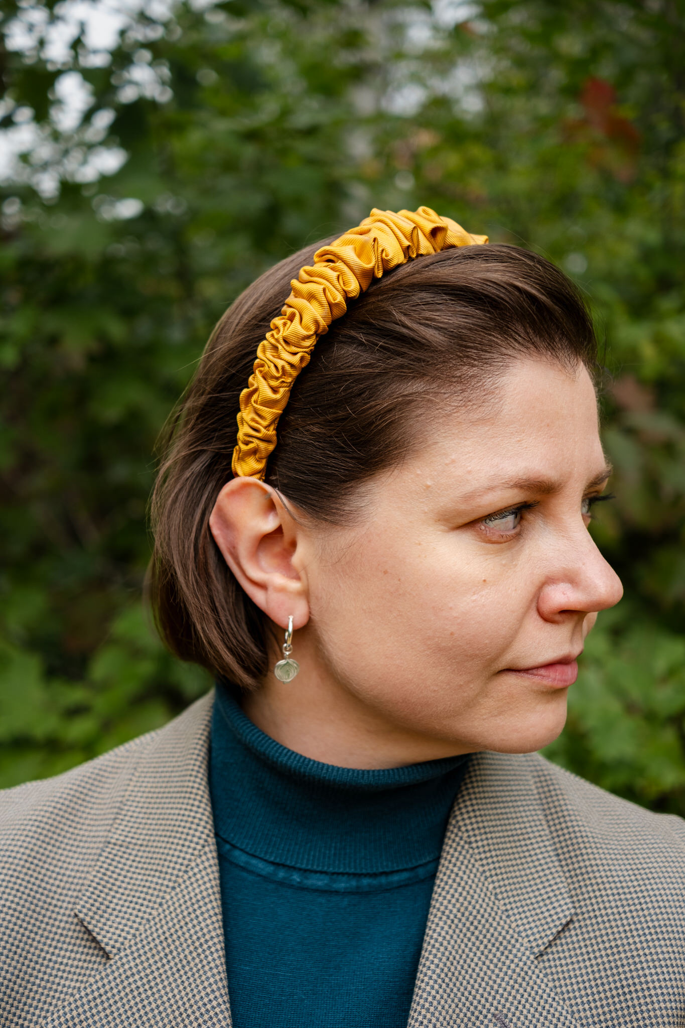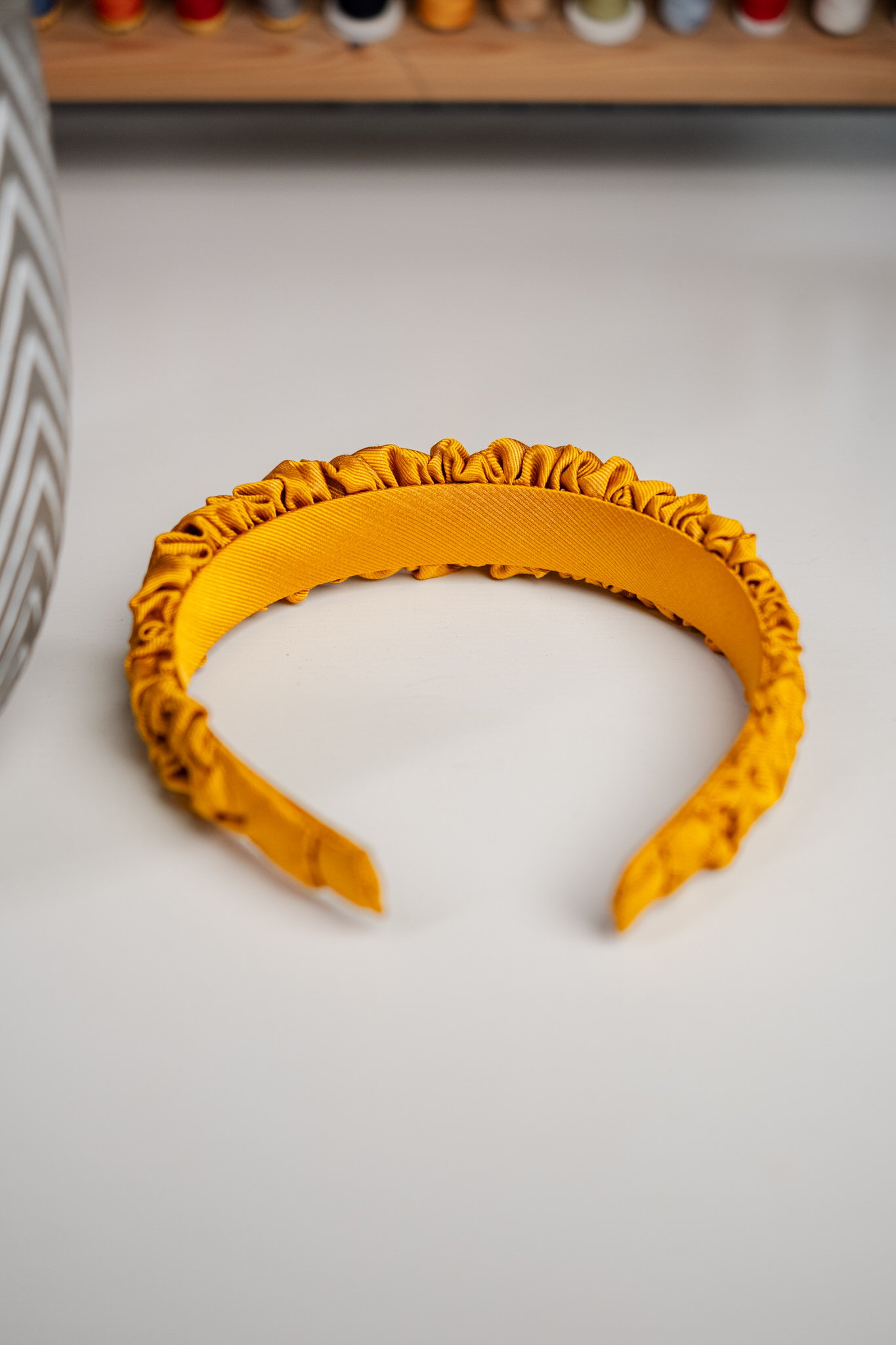 Jedwabna opaska do włosów drobno marszczona. Opaska bez wzoru, w miodowym, ciepłym, żółtym kolorze – jak jesienne liście. Tkanina połyskująca, jedwab tkany w widoczny skośny prążek.