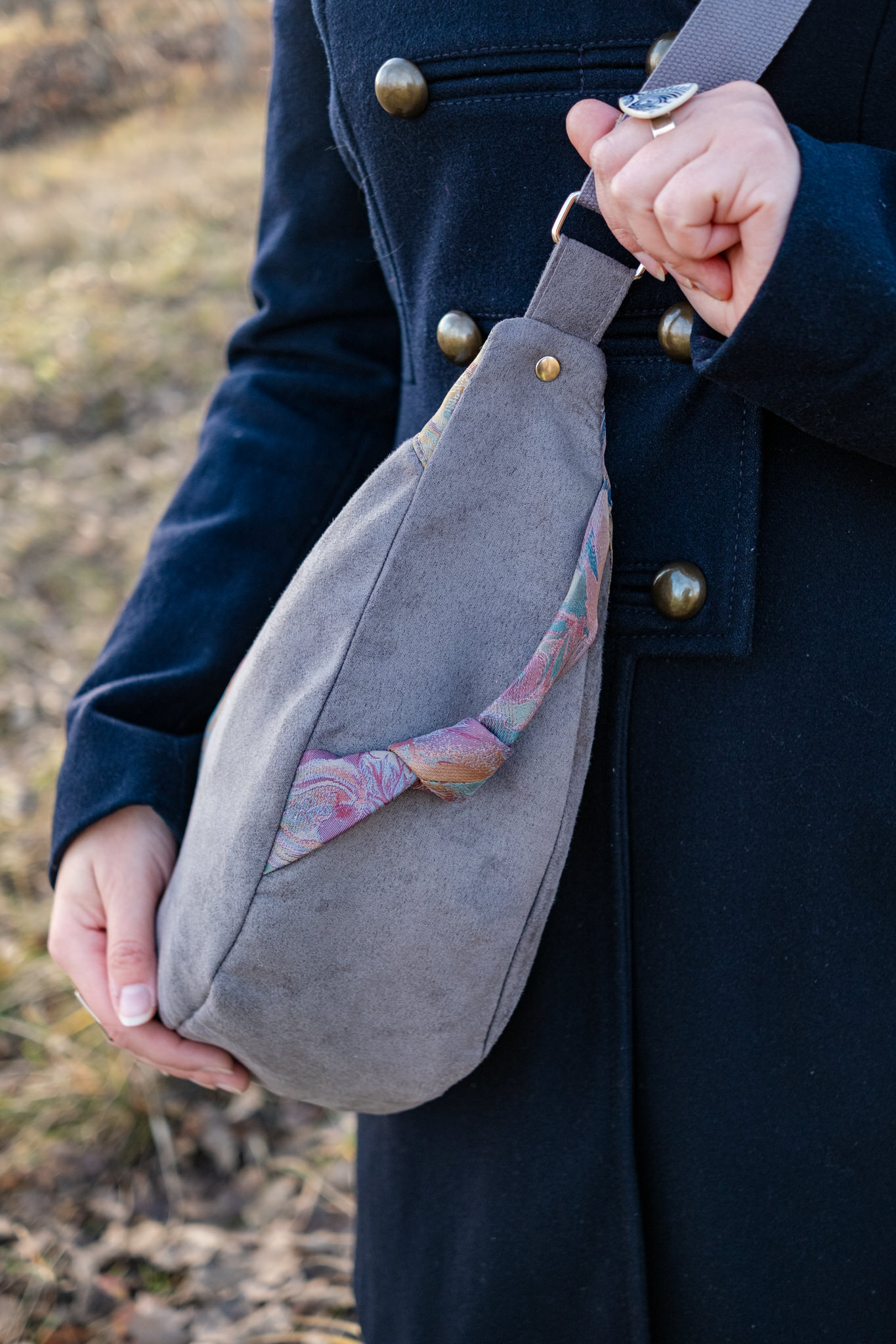 Materiały zewnętrze to szara tkanina tapicerska – wytrzymała, trwała i odporna. Jest to tkanina nowa, w pełni wartościowa, której nie umiano wykorzystać dalej w masowej produkcji z powodu niewielkich rozmiarów i niestandardowych kształtów. Uroku klasycznej szarości dodaje tkanina o nietypowej, fantazyjnej kolorystyce. To poliestrowy krawat – rozpruty i naszyty na torbę. Naszycie krawata wraz z uroczym węzełkiem, to mój autorski pomysł na upcykling poliestrowych krawatów, które są uciążliwym tekstylnym odpadem, trudnym do wykorzystania.