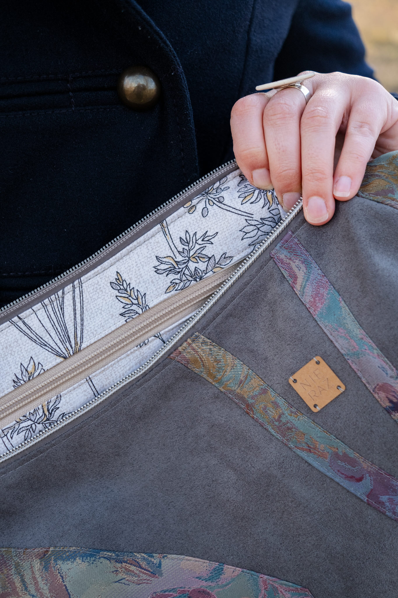 Wnętrze uszyte z kawałków bawełny z drugiego obiegu. Wzór podszewki to delikatne polne rośliny na beżowym tle oraz beżowe kieszonki.